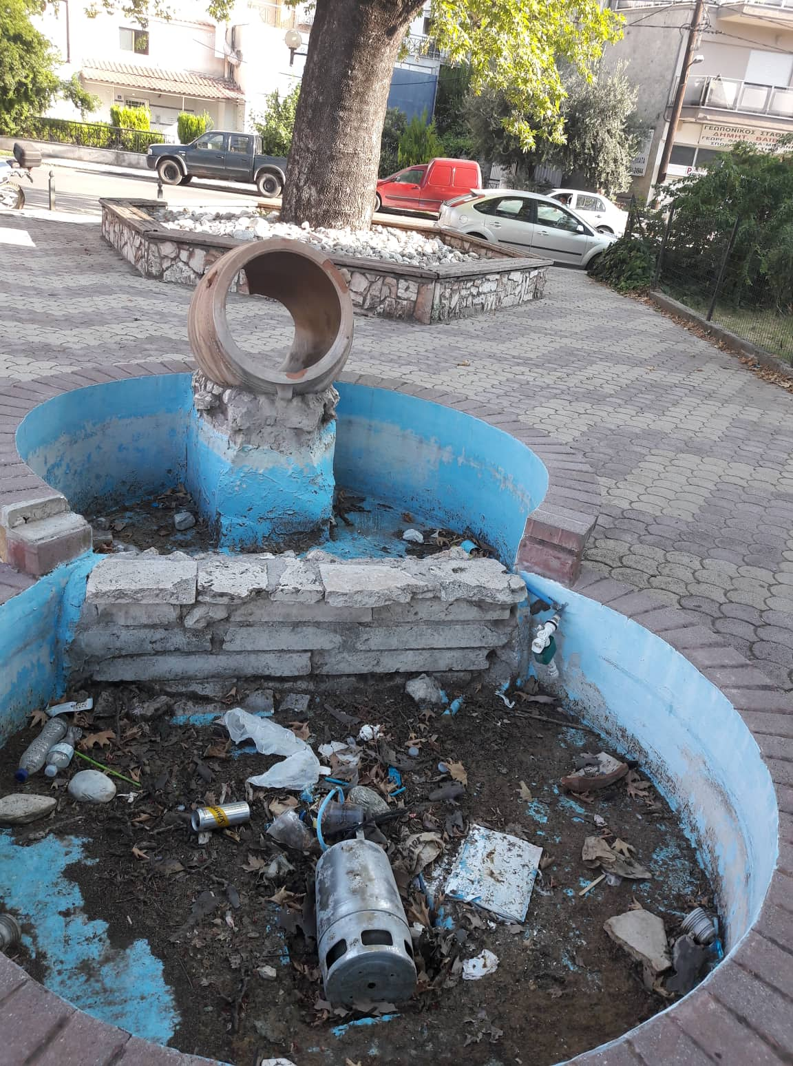 Περπατούν μάνα και γιός χθες πίσω από το 1ο Γυμνασιο Αριδαίας ,σταματούν και βλέπουν το εν λόγω συντριβανάκι που είναι μέσα στην βρόμα και τα μπάζα ...